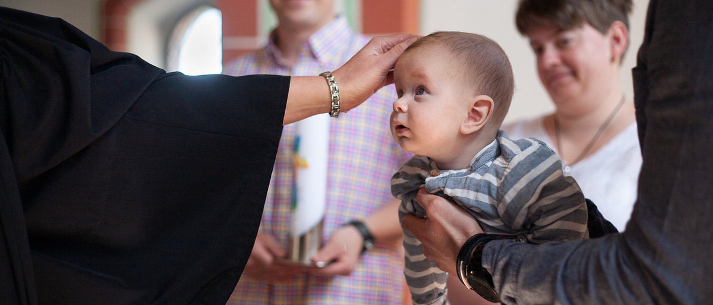 Das Sakrament der Taufe bedeutet die feierliche Aufnahme eines Menschen in die christliche Gemeinde. Bei der Zeremonie gießt die Pfarrerin oder der Pfarrer einige Tropfen Wasser über den Kopf des Täuflings. Dieses Ritual geht zurück auf die Taufe Jesu durch Johannes den Täufer, von der die Bibel erzählt.