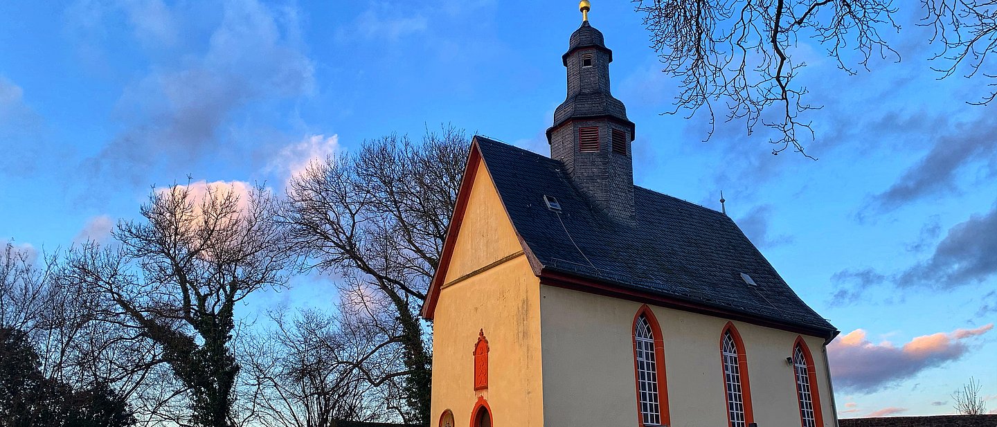 Die Kirche wird von einer hohen Wehrmauer mit Schießscharten umgeben. Sie geht wohl auf das 15. Jahrhundert zurück. Zum Ort hin hat sie ein spitzbogiges Tor mit dem Ysenburgischen Wappen. Innerhalb und außerhalb der Wehrmauer liegt der Friedhof.