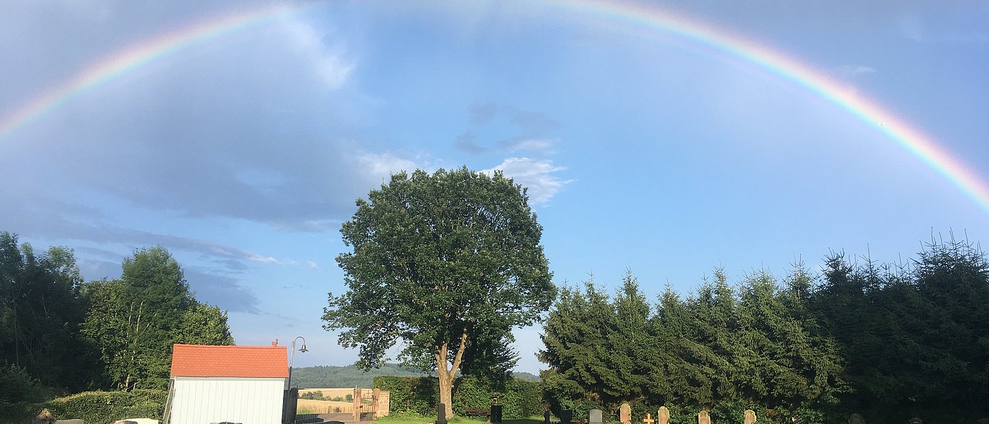 Unser Friedhof ist mehr als nur eine Ruhestätte; er ist ein Ort mit Geschichte und Aussicht. Auf einer Anhöhe gelegen, öffnet sich von hier aus ein herrlicher Blick auf die historische Herrnhuter Siedlung und die majestätische Ronneburg.